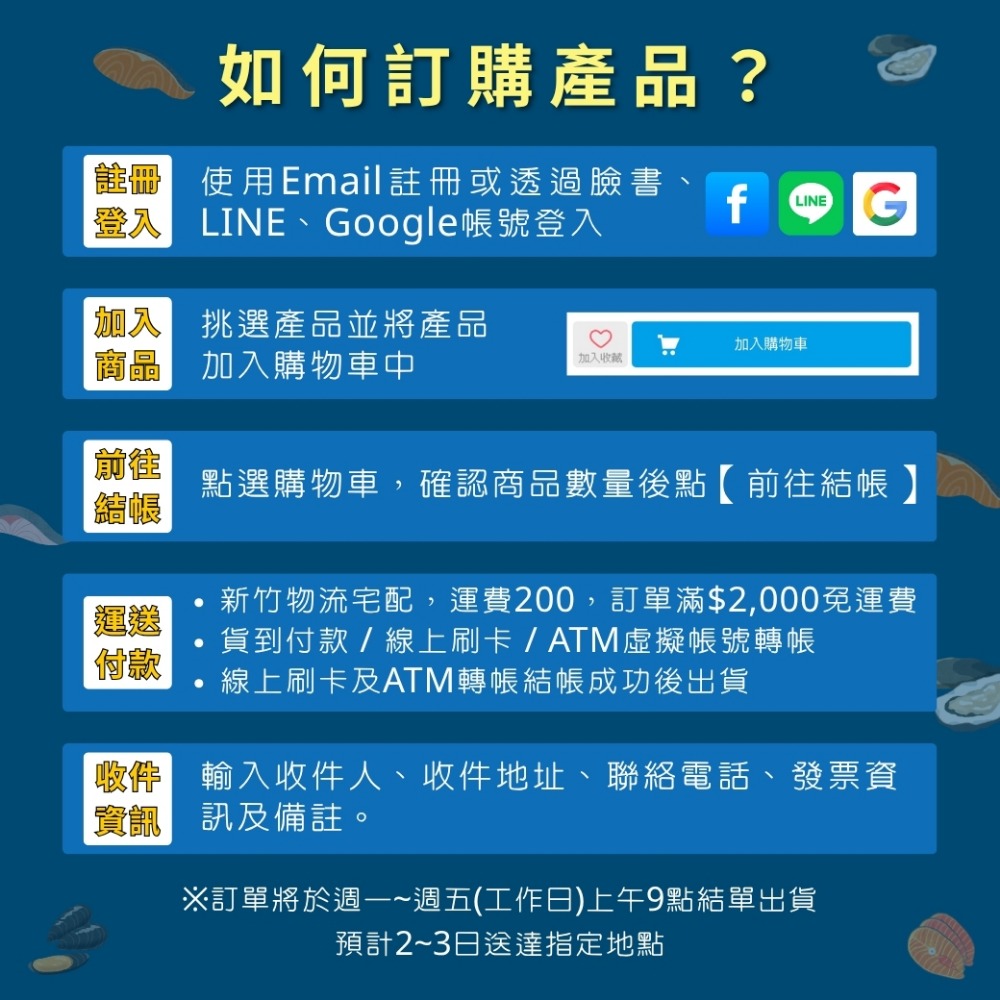 ☆ 每一件須自付宅配(-18℃)200元。 ☆ 此商品均冷凍宅配,送貨範圍限台灣本島。 ☆ 宅配時間為確認匯款後開始起算1-3個工作天。 ☆ 商品以實物為主,圖片僅供參考。 ☆ 為確保食用安全,收到商品後請即刻冷凍(-18度C)保存,並盡速食用,以享食物鮮美。 ☆ 產品解凍後請0℃~7℃冷藏保存,勿重複冷凍,並於兩日內食用完畢。 ☆ 解凍時間因設備與天候狀況差異,可依據實際需要調整時間。 ☆ 本公司保留修改活動及調整商品內容等細節之權利。