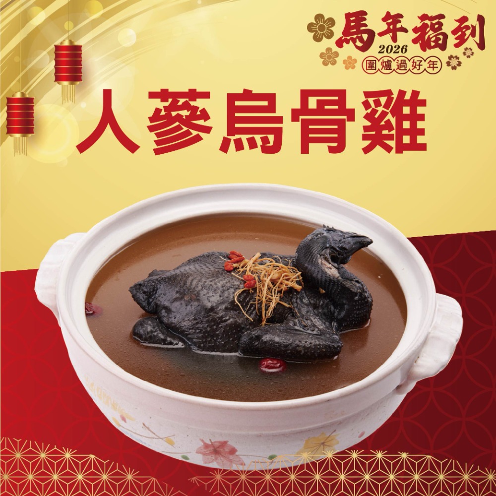 內容物:水、烏骨雞、米酒、高湯粉【砂糖、鮮雞風味粉(鹽、L-麩酸鈉、麥芽糊精、酵母抽出物、砂糖、水解植物大豆蛋白粉、洋蔥粉、香料)、L-麩酸鈉、豚骨風味粉[食鹽、L-麩酸鈉、麥芽糊精、酵母抽出物、砂糖、水解植物大豆蛋白粉、砂糖、糊精、耐炸油(軟質棕櫚油、大豆油、芥花油)、蒜粉、洋蔥粉、香料、5'-鳥嘌呤核苷磷酸二鈉、5'-次黃嘌呤核苷磷酸二鈉]、酵母抽出物、食鹽、蒜粉、洋蔥粉、香菇粉、5'-鳥嘌呤核苷磷酸二鈉、5'-次黃嘌呤核苷磷酸二鈉、玉米糖膠、青蔥粉、甘草粉、香料】、人蔘鬚、黨蔘、鮮雞風味粉【食鹽、L-麩酸鈉、麥芽糊精、酵母抽出物、砂糖、水解植物大豆蛋白粉、洋蔥粉、香料】、人蔘香料【葡萄糖、丙二醇、磷酸鈣、香料】、枸杞